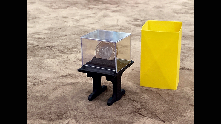 The magician shows a small pedestal surmounted by a transparent case. He removes it and, from the pedestal, takes away and shows a stand with a slit in the center. He puts this stand back on the pedestal and puts the case back in position by blocking the pedestal and case with an elastic band. He covers everything with a rectangular tube and after a moment, he removes it and a coin will have magically appeared in the case, displayed vertically on the stand!